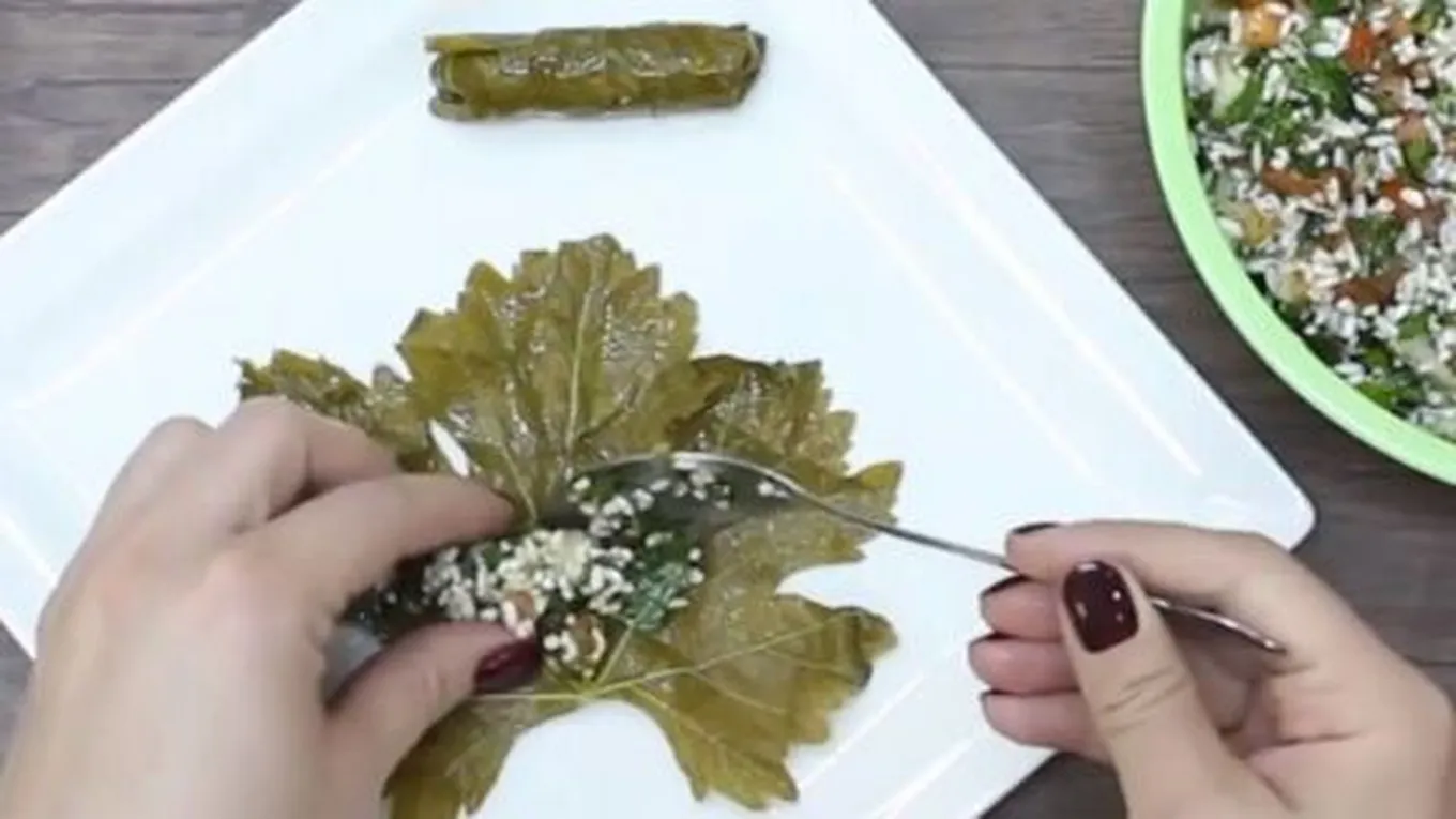 - وضع كمية من الحشوة في ورقة من العنب، ولفها على شكل أصابع.
