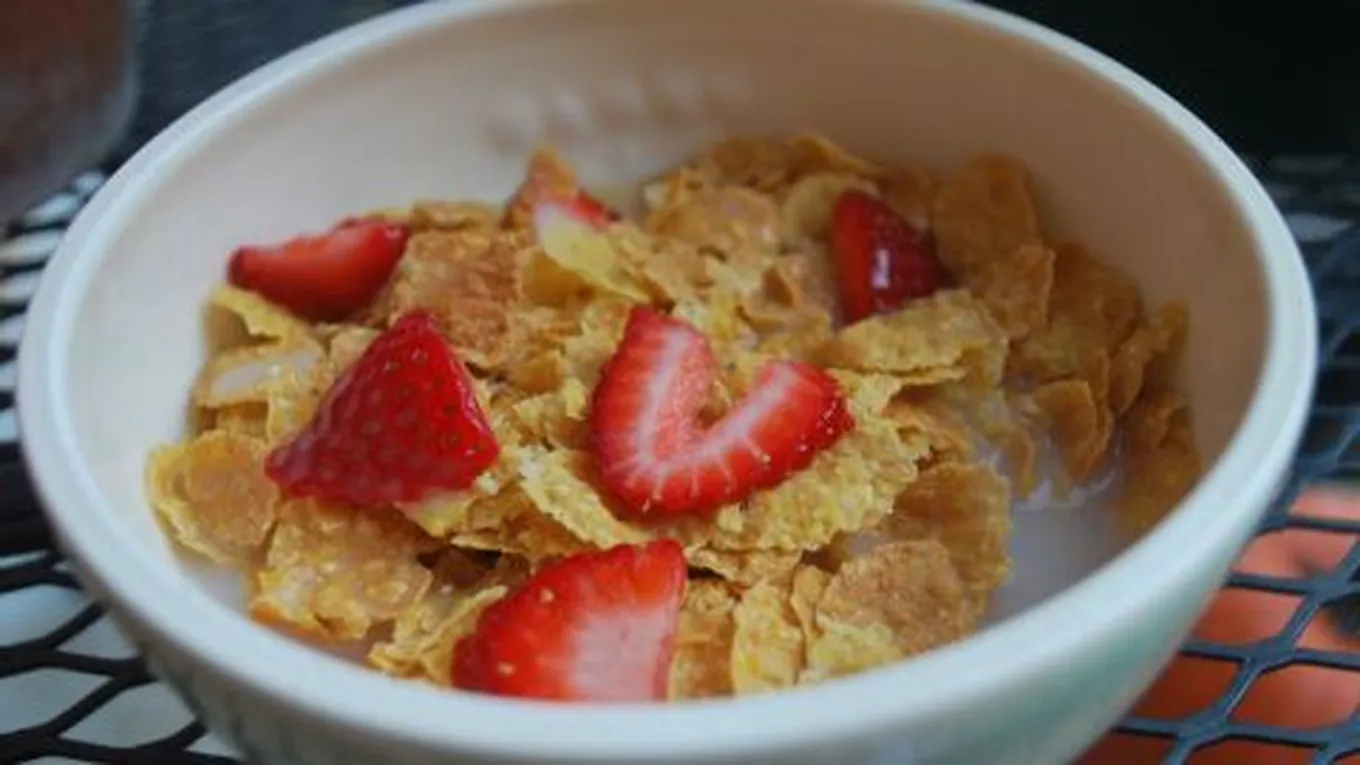 - نضيف الكورن فليكس إلى اللبن ونزيّنه بالفراولة.