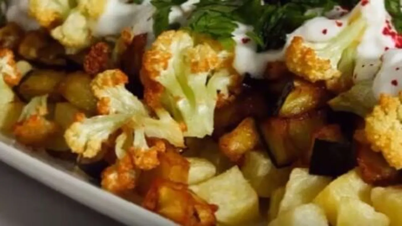 - نقلي قطع الباذنجان، والزهرة، ونضعها في طبق التقديم مع الطماطم.