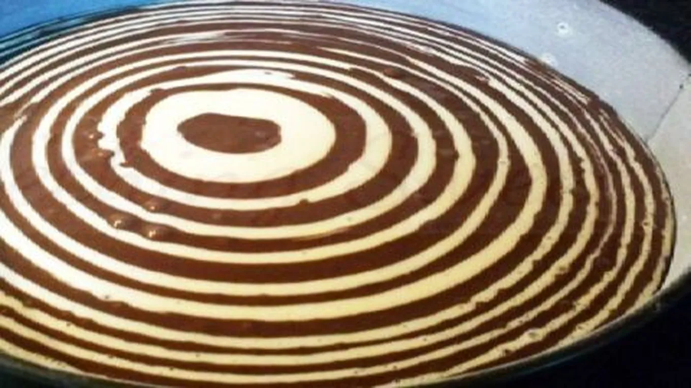 - اسكبي بمقدار ملعقة كبيرة من المزيج الأبيض في وسط الصينية المدهونة بالقليل من زيت الزيتون، ثمّ اسكبي ملعقة أخرى من الطحين مع الشوكولاتة في داخل المزيج الأبيض، وكرري العملية حتى تنتهي من جميع الكمية الموجودة.