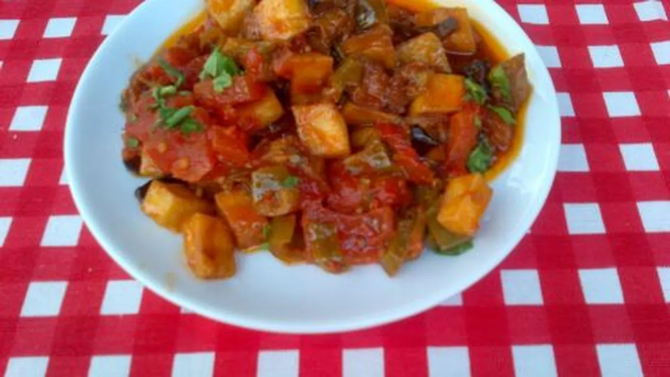 - تقشير البطاطا وتقطيعها إلى مكعباتٍ متوسطةٍ مقاربة لحجم الباذنجان وفرم الفلفل الأخضر.