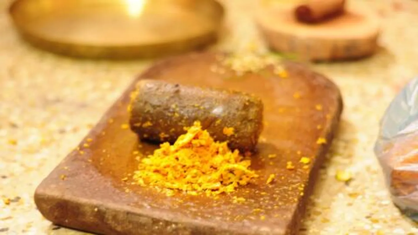 - تُمزج كمية من الكركم، وكمية من مسحوق خشب الصندل.
