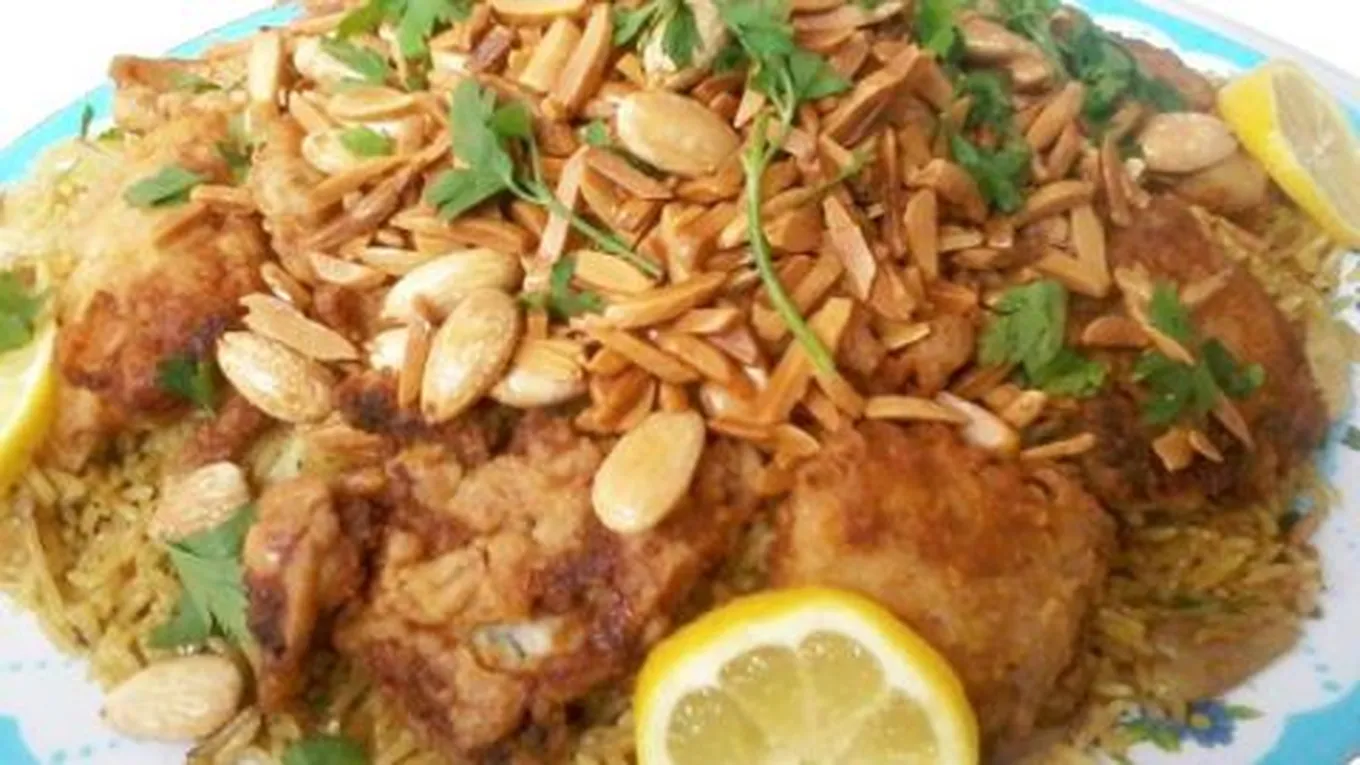 - نسكب الأرز في طبق التقديم، ونضع فوقه قطع السمك المقلية، ونزينه بالصنوبر المقلي وزيت الزيتون، ونقدمه بجانب الصلصة.