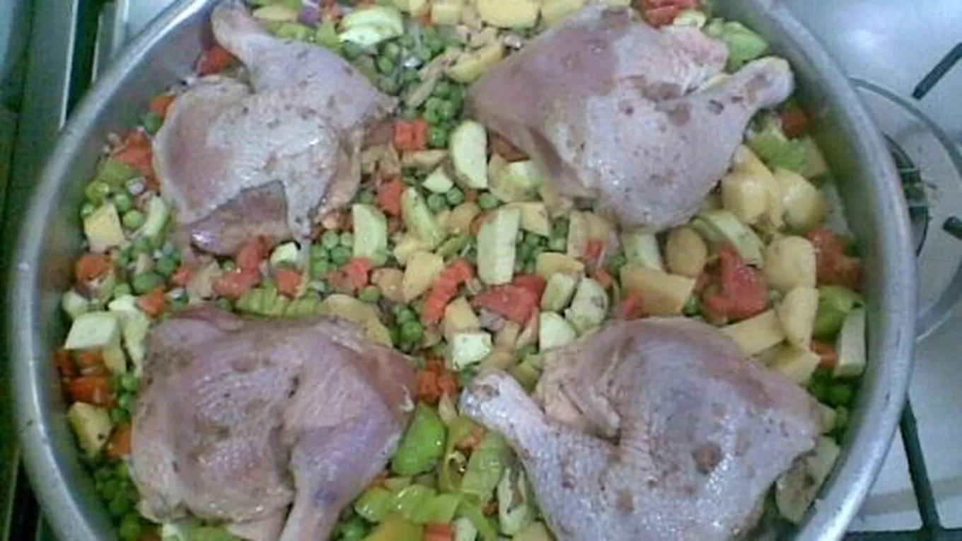 - يُنقل خليط الخضراوات إلى طاجن وتوضع قطع الدّجاج على وجهه.