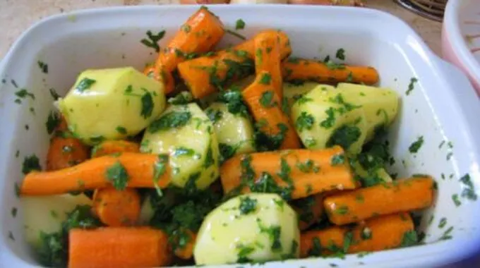- أخرجي الصينية من الفرن بعد أن تنضج جميع الخضار، ثمّ غطّها بورق النايلون لتبقى طريّةً ولا تنشف إلى أن تبرد جيداً، ثمّ قشّريها وقطعيها بالشكل والحجم الذي ترغبين به.