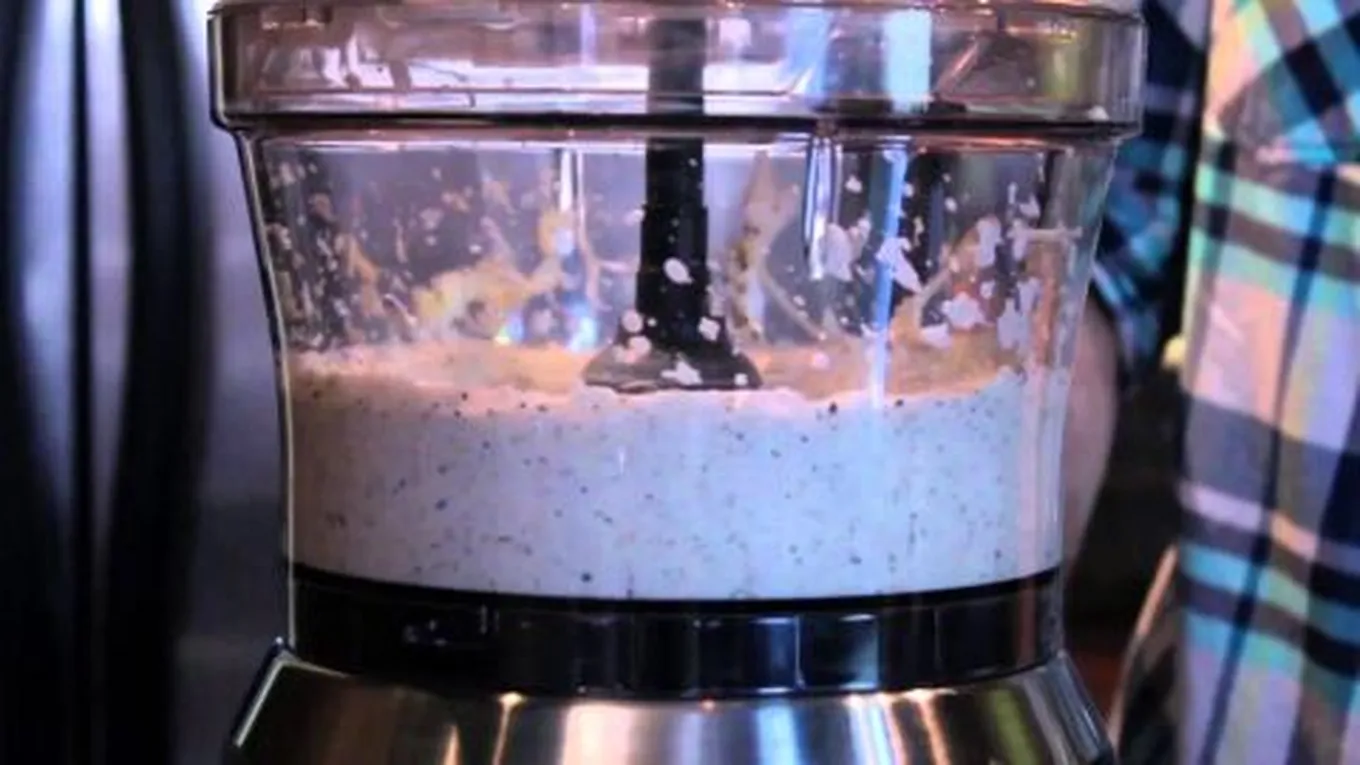 - نضع زبادي مع مكعبات الثلج في وعاء جهاز الخلاط الكهربائي.