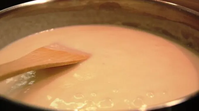 - ضعي كميّة الحليب وقلبي المكوِّنات جميعها حتّى يثخن قليلاً، واستمري في التّقليب حتّى لا يتكتَّل الدّقيق.