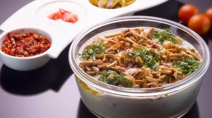 - نصبّ خليط الثّوم والزبدة فوق الّلبن ونُزيّن الوجه بالبقدونس المفروم والصّنوبر.