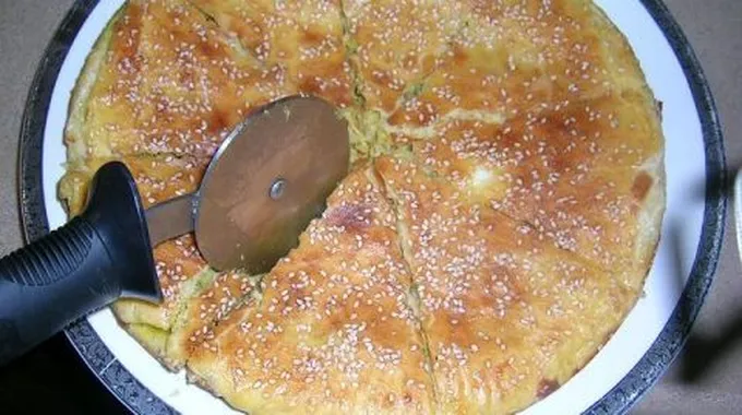 - نضع الفطيرة في صينيّة فرن مغلّفة بورق زبدة، وندهن وجهها بالبيض المخفوق.
