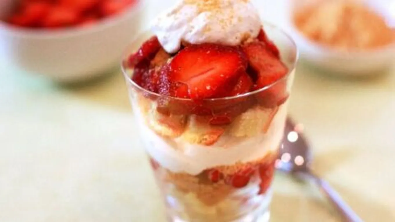 - نوزّع الفراولة المقطّعة فوق الكريمة.