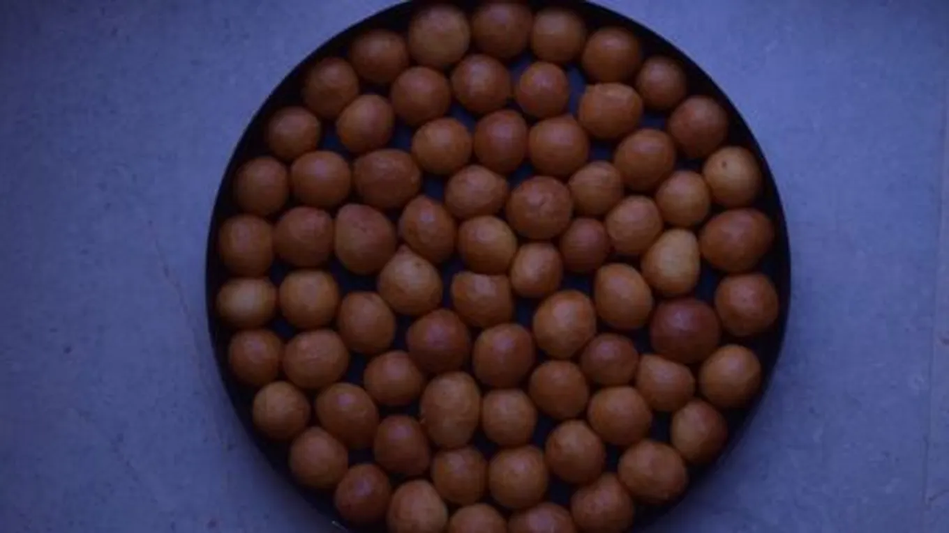 - تقليب اللقيمات بواسطة ملعقة شبكية إلى أن تصبح ذهبية اللون.