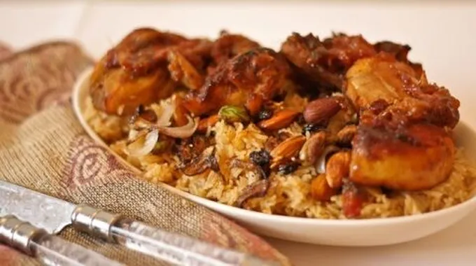 - نسكب الأرز في صحن التقديم، ونضع فوقة الدجاج المحمر ونزينه بالمكسرات.