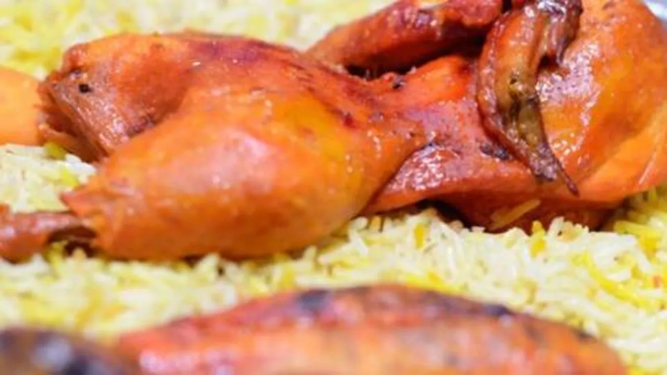 - نضع قطع الدجاج المحمرة فوق الأرز، ونضع قطعتين من الفحم في ورق الألمنيوم، وملعقة صغيرة من الزيت النباتي، ويجب إحكام الغطاء على الوعاء.