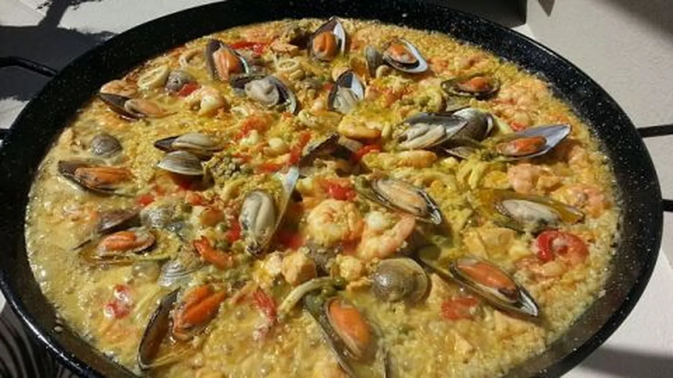 البايلا الإسبانية مدّة تجهيز المكوّنات عشر دقائق مدّة الطهي ثلاثون دقيقة تكفي لِ سبعة أشخاصالمكوِّناتكوبان ونصف من أرز أربوريو أو مصري.سبعة أكواب من الشوربة أو