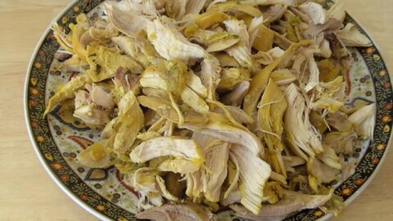 - نخرج قطع الدجاج من المرق ثم نتركها جانباً لتبرد قليلاً، ونبدأ بنزع العظم عن الدجاج ونقطعه قطعاً صغيرة.