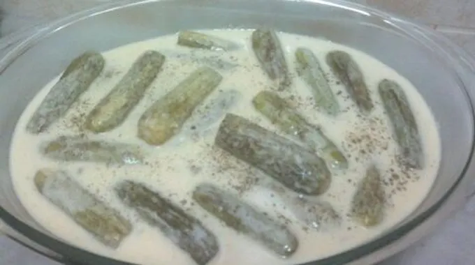 - نُضيف حبات الكوسا في قدر اللبن ونتركها مدة خمس دقائق، ونرفعها من اللبن ونضعها في طبق عميق، ونصب اللبن فوقها.