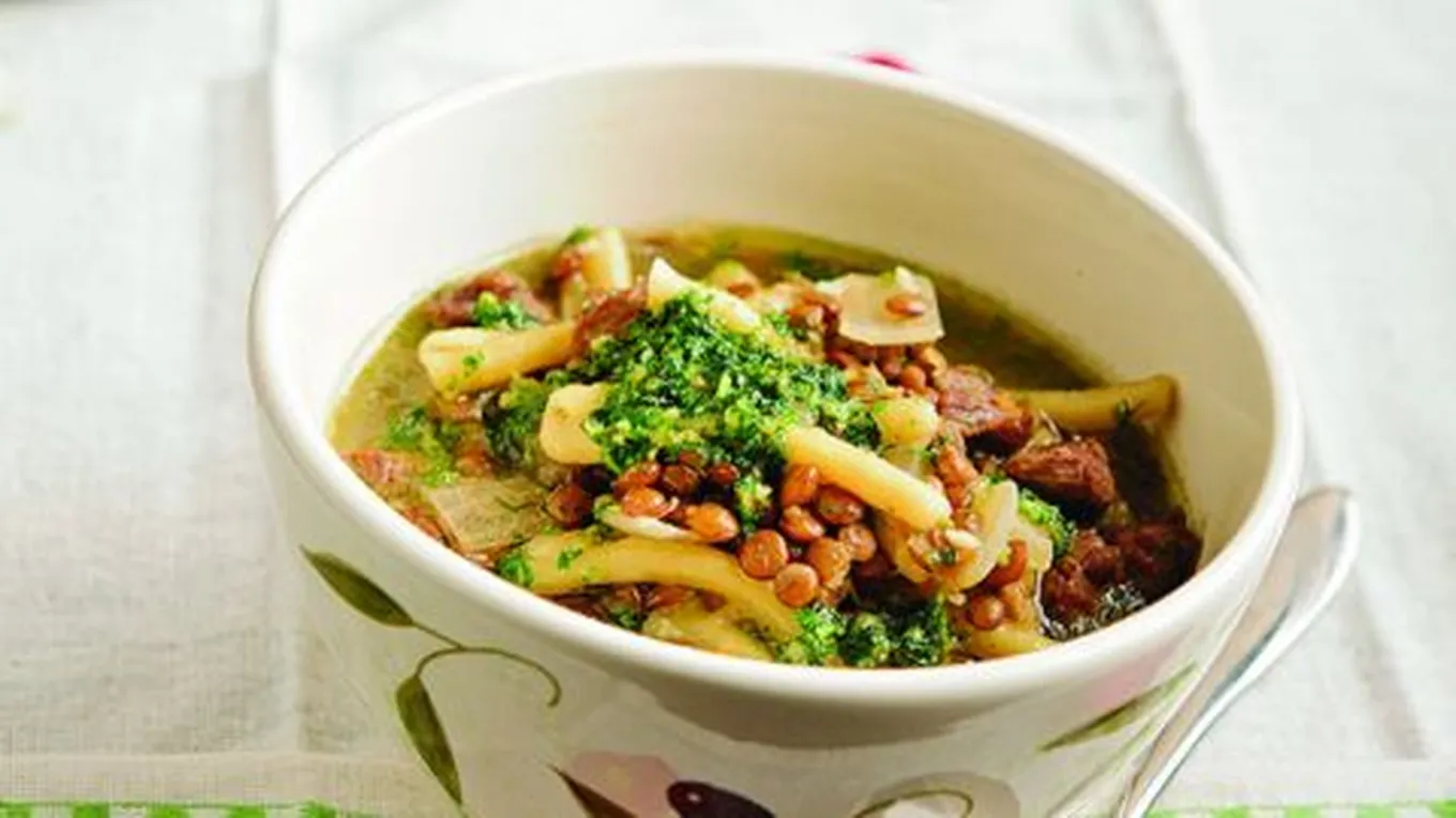 - نسلق المعكرونة في الماء المملح، نصف سلقة، ونسلق العدس بالماء نصف سلقة.