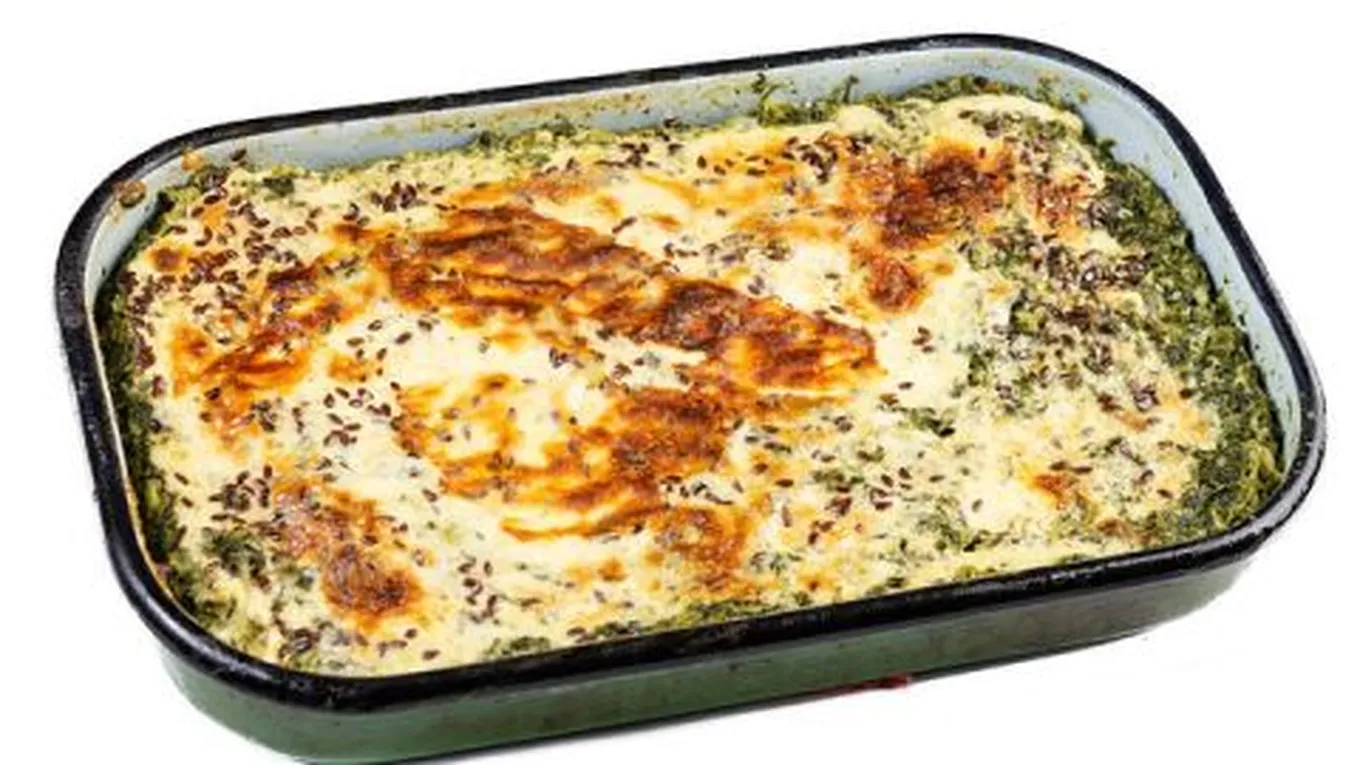 - إدخال الطبق إلى الفرن لمدة من أربعين إلى خمس وأربعين دقيقةً حتى يتماسك البيض وتذوب الجبنة وتتحمّر.