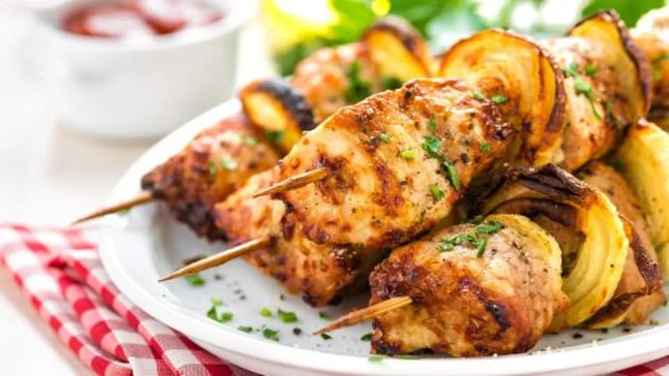 - شك قطع الدَّجاج مع الطماطم ومكعبات الفلفل الحلو بالتبادل في الأسياخ الخشبية.