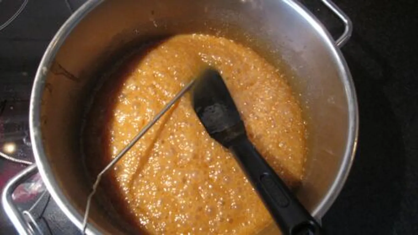 - تقلّب الصلصة لمدة ستين دقيقة أو حتى تصل درجة حرارتها مئتين وأربعين درجةٍ مئوية وتتشكّل كرة ناعمة متماسكة.