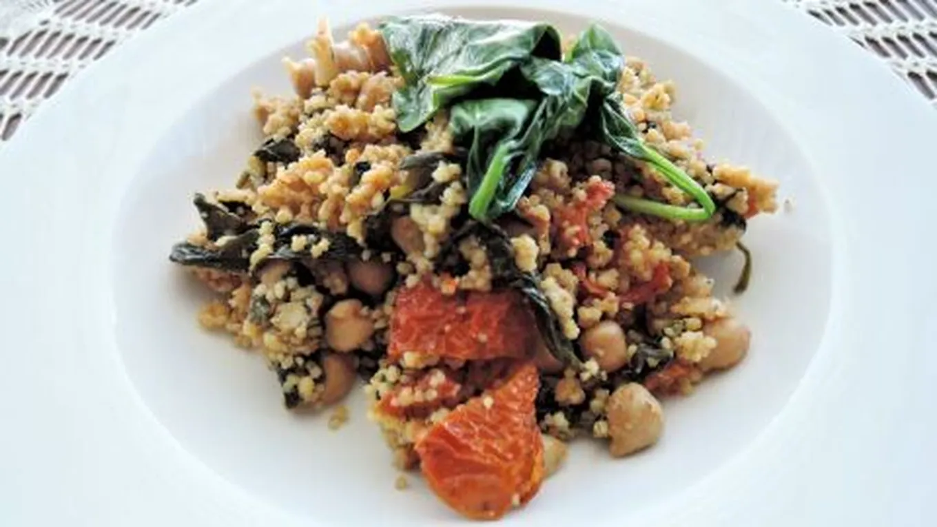 - خلط الكسكس مع الماء المغلي في وعاء كبير ومقاوم للحرارة وتغطية الوعاء بغطاء بلاستيكي وتركه جانباً لمدّة عشر دقائق تقريباً.