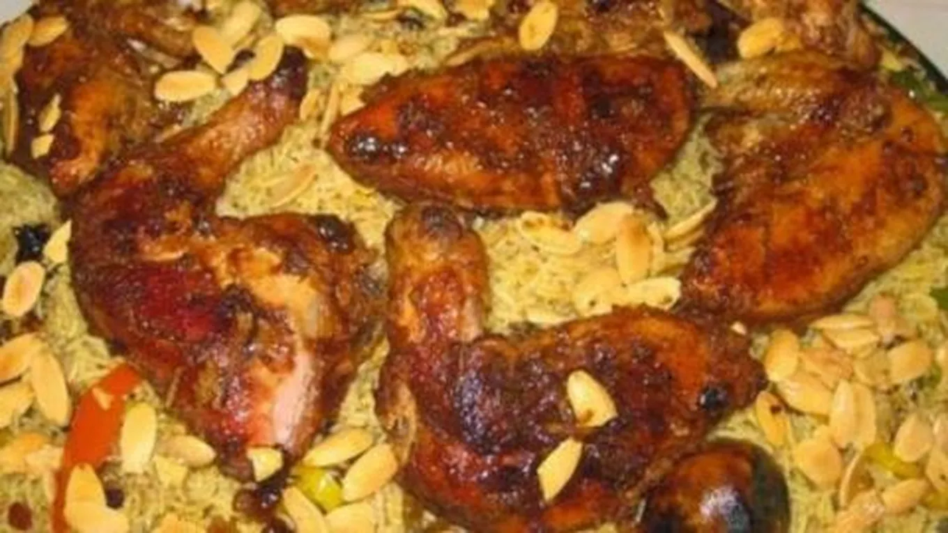 - نضع الأرز في طبق كبير للتقديم، ثم نضع قطع الدجاج فوقه، وننثر عليه المكسرات المحمّصة، ونقدمه للأكل مع السلطات.