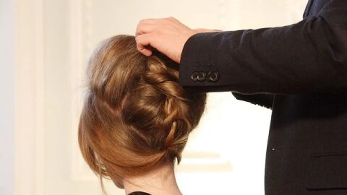 - يسحب الجزء العلوي من الشعر إلى أسفل، ثمّ يُثبت باستعمال الدبابيس.