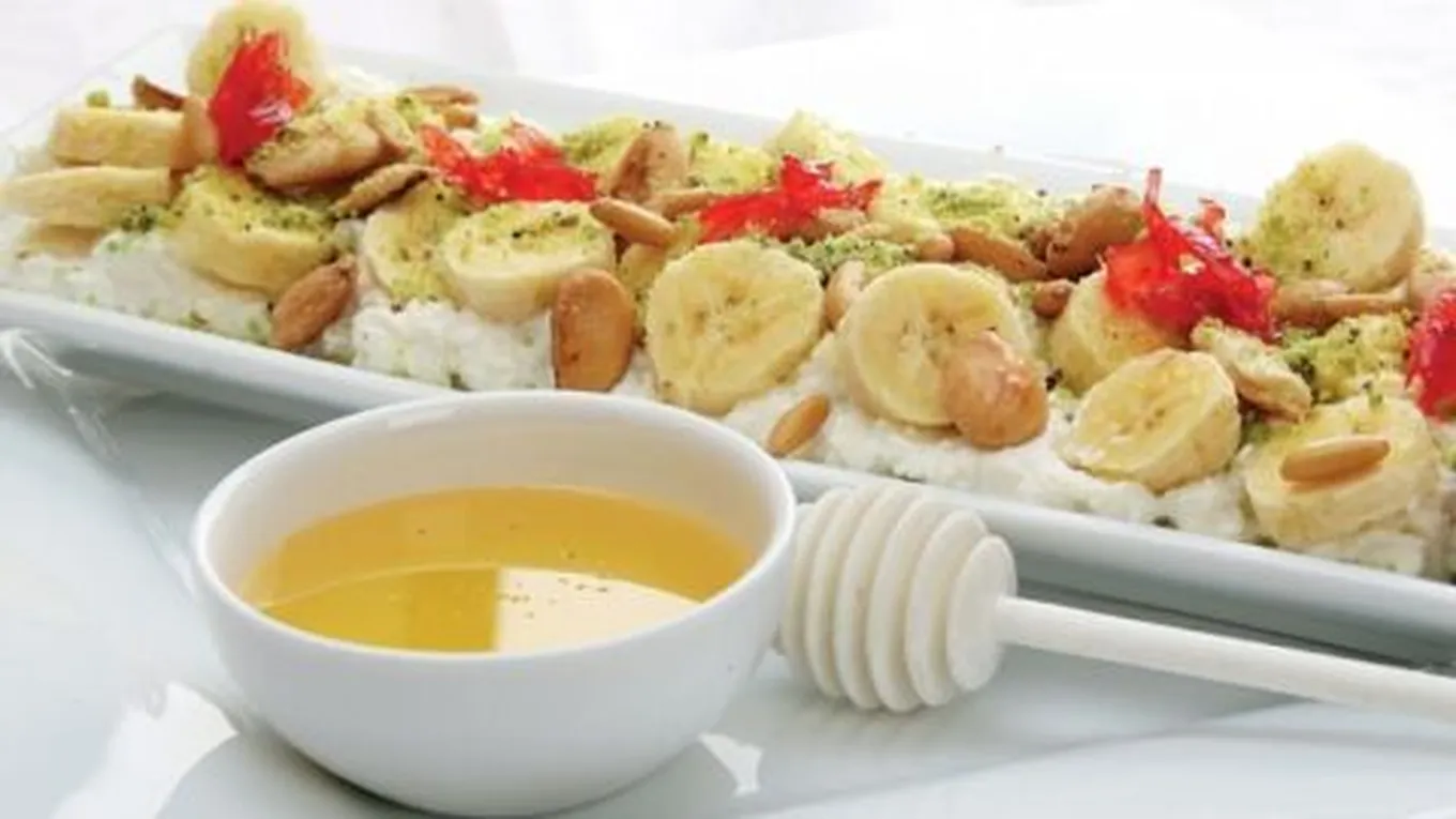 - لتحضير الحشوة، اخلط القشطة بملعقة كبيرة من عسل النحل في وعاء.