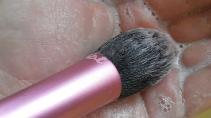 - وضع شامبو الأطفال أو الصابون القشتالي السائل على راحة اليد ثمّ تُحرَّك فرشاة المكياج على الشامبو بشكل دائري لإزالة الاوساخ العالقة في الفرشاة.