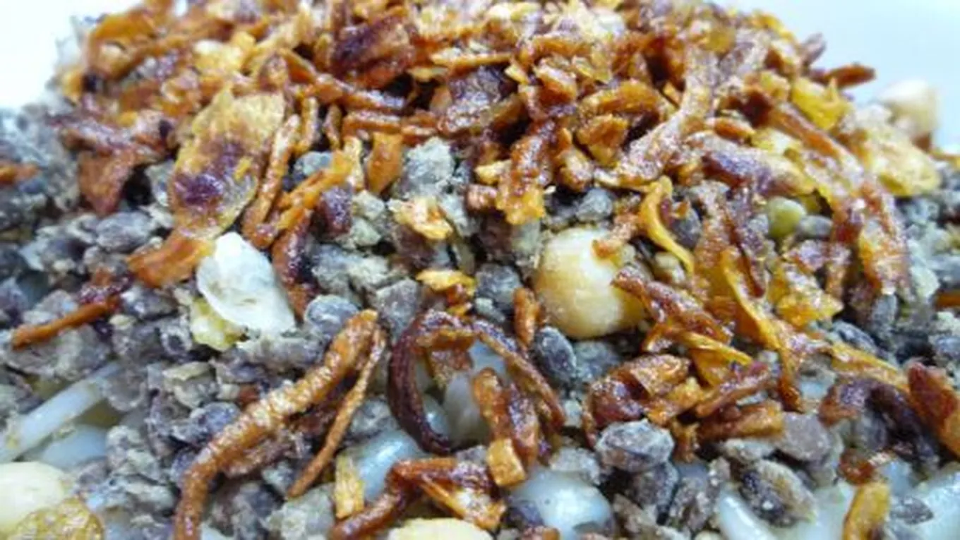 - للتقديم: نغرف كمّية من الأرز بوساطة مغرفة، ونضعها في طبق التقديم، ثمّ نضيف العدس، والحمّص، والمعكرونة فوقها، ثمّ نضيف صلصلة الطماطم، ثمّ البصل المحمّر.