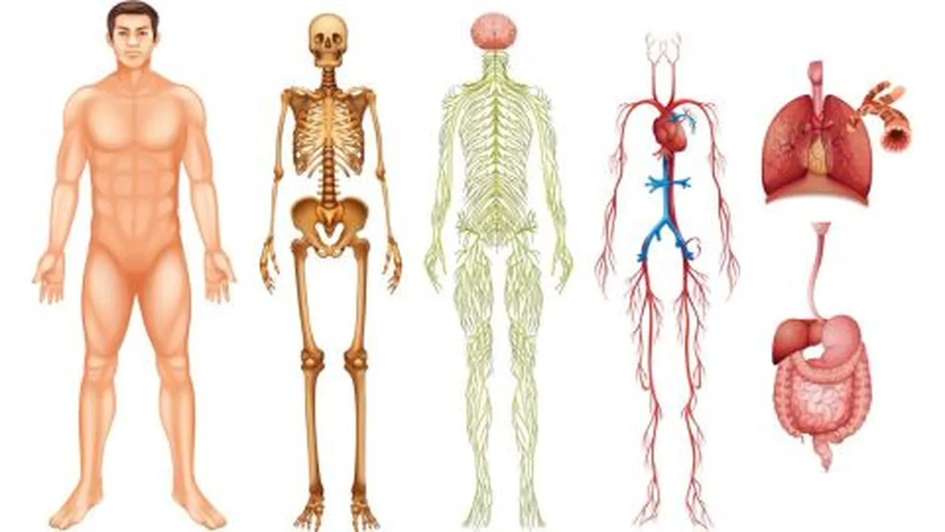 الرأس: وتتكون من العظام : جمجمة وفك وأسنان وما تحتويه من أعضاء (أذن، عين، أنف، مخ، لسان) وما تحتويه من أجزاء خارجية (فم، فروة رأس، وجه، شعر، شفة) والغدد (غدة لعابية).