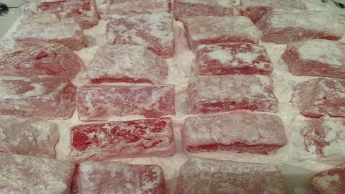 - نقطع الحلقوم إلى مربعات، ونرش فوقها مسحوق النشا، ونتركه حتّى يبرد.