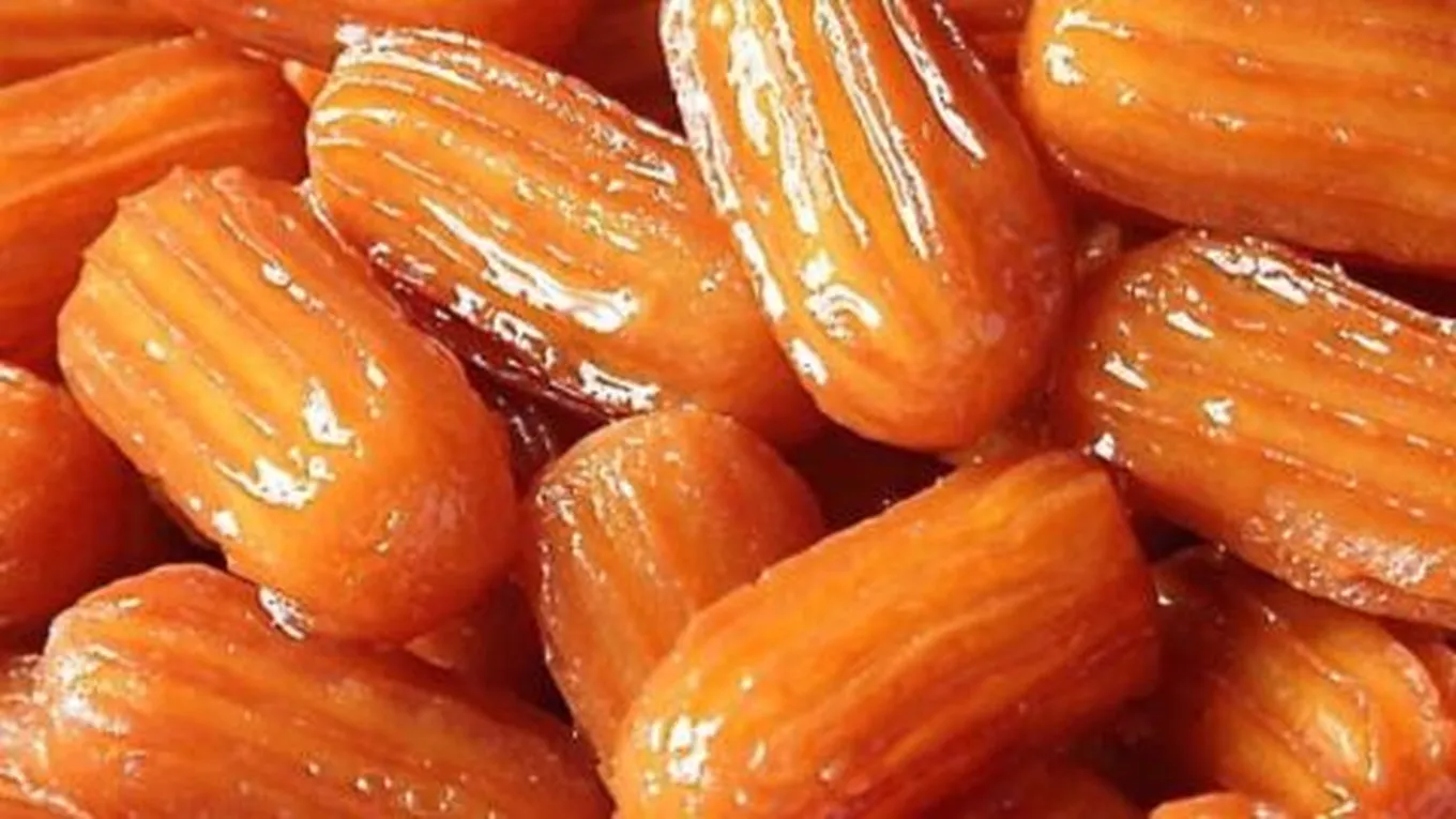 - تقلى حبات بلح الشام حتى تتقرمش، ثمَّ تسقى بالقطر.