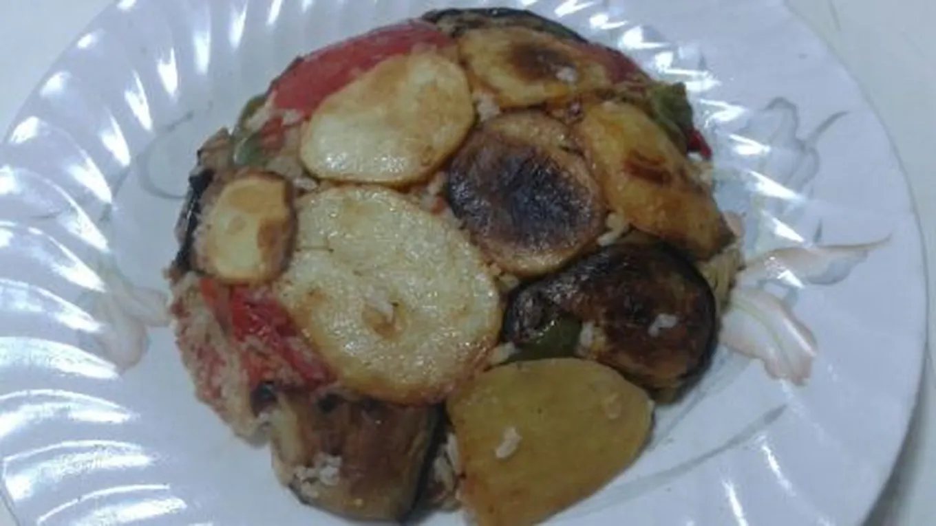 - وضع الأرز في طرق واسع، ووضع الباذنجان عليه ثمَّ تقديم المقلوبة ساخنة.