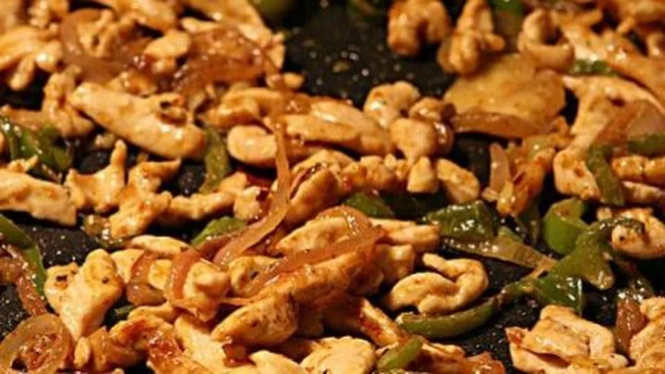 - إضافة خليط البصل والفلفل الأخضر إلى مقلاة الدجاج، وتقلب جيداً حتى تمتزج المكونات مع بعضها.
