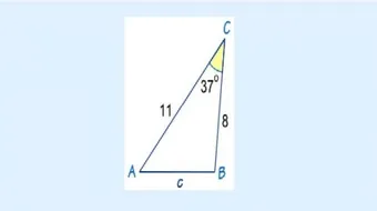 احسب طول الضلع ج في مثلث فيه الضلع أ=11، والضلع ب=8، والزاوية المقابلة للضلع ج(جَ)=37 درجة؟باستخدام قانون جيب التمام: ج2=أ2+ب2-2أب جتا(جَ)=28+211-2*8*11* جتا (37)=64+121-176*0.798=44.44، ومنها ج=الجذر التربيعي (44.44)=6.67 بالتقريب إلى أقرب منزلتين