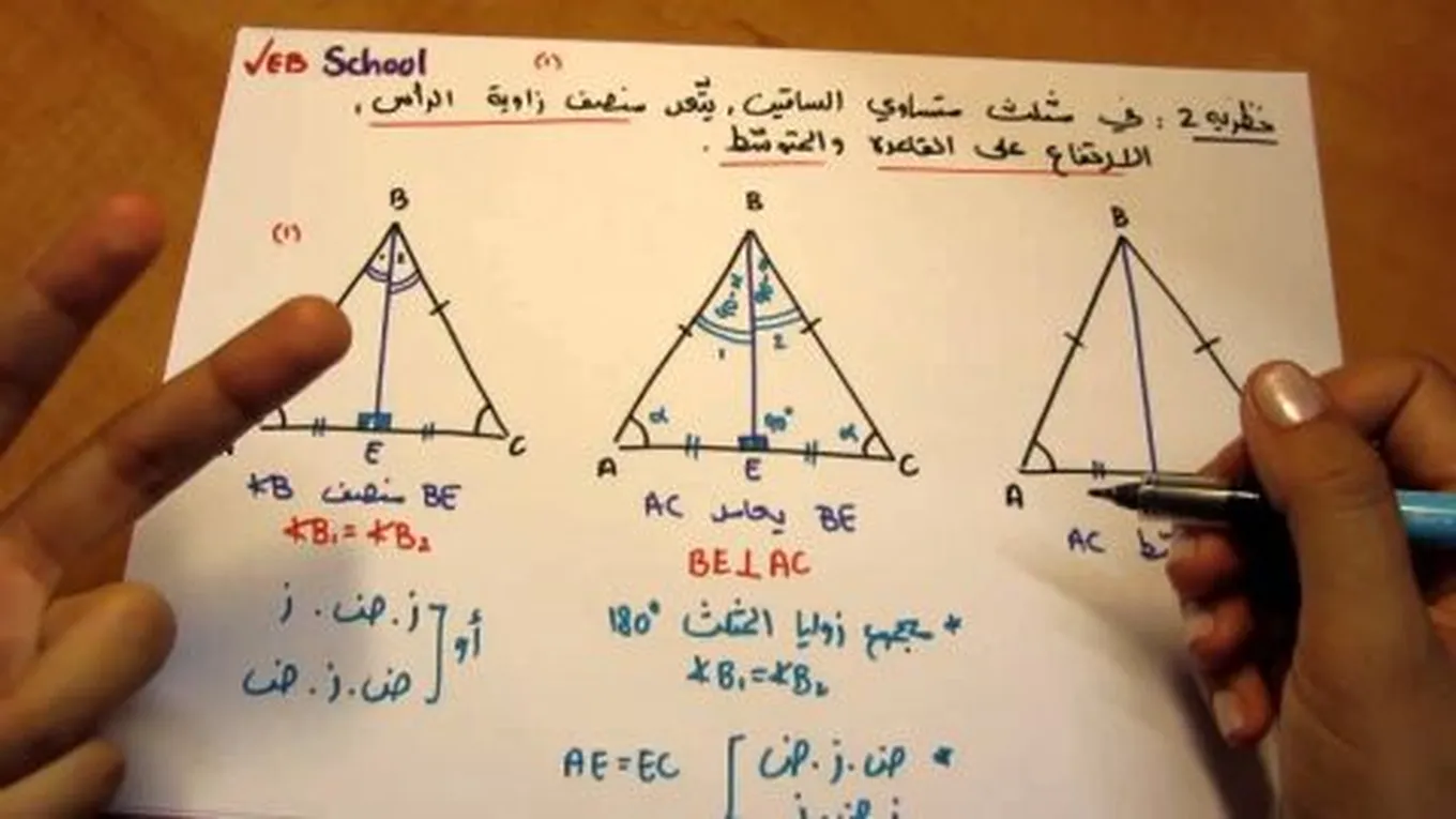 - نصل بين رأس المثلث ونقطتي القاعدة، فيتشكّل المثلث متساوي الساقين.