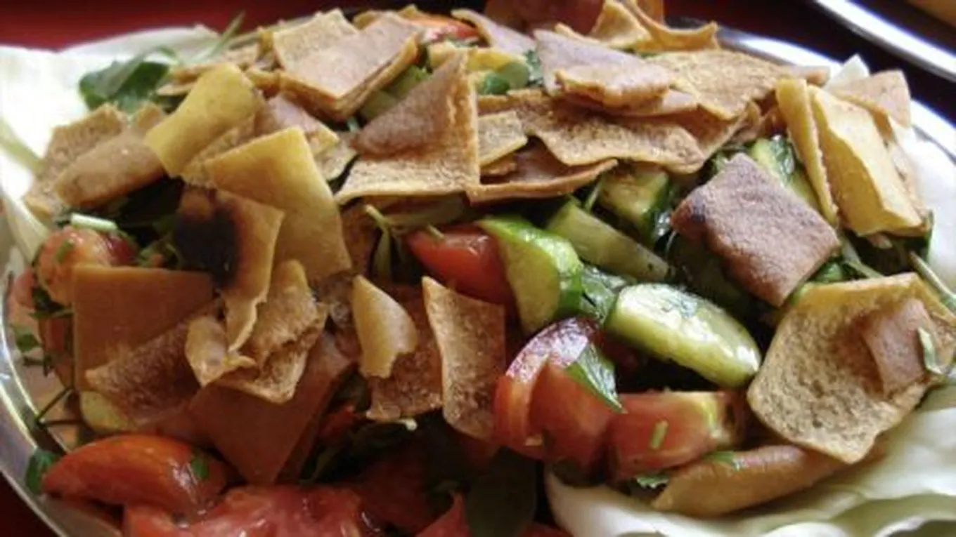 - خلط جميع المكونات ووضعها في وعاء التقديم، وإضافة الخبز العربي المحمَّص والمقطع قطعاً صغيرة على الوجه.