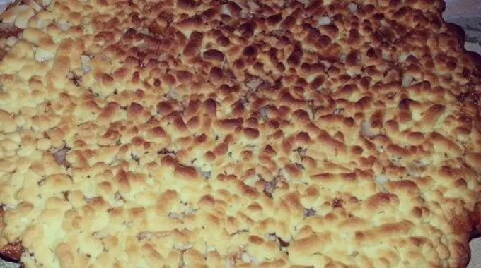 - نحضر العجين الموجود بالفريزر، ثمّ نحضر المبشرة ونستعمل الجهة الصغيرة منها، ونبرش العجين ونوزّعه على كامل الصينيّة بشكل عشوائيّ.