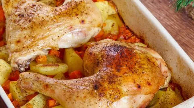 - نسخن الفرن على درجة حرارة 200 درجة مئوية، ونضع كوباً من الماء في الصينية، ثم ندخل الصينية إلى الفرن لمدة ربع ساعةٍ تقريباً، ثم نغلف الصينية بقطعةٍ من ورق الألمنيوم، ونعيدها إلى الفرن لمدة ربع ساعةٍ أيضاً، أو حتى نتأكد من نضج الدجاج والخضروات.