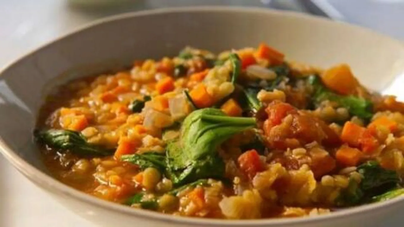 - نسكب المرقة مع الخضار واللحم فوق القرصان.