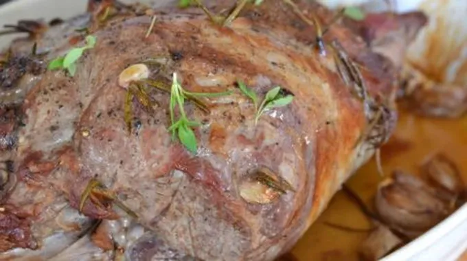 - وزّع الخليط السابق على فخذ الخروف، وتأكّد من تغطيته لجميع جوانبه، ثمّ ضع حبّات الثوم في منتصف قطعة اللحم، واربطها بشكلٍ جيّد باستخدام الخيط.