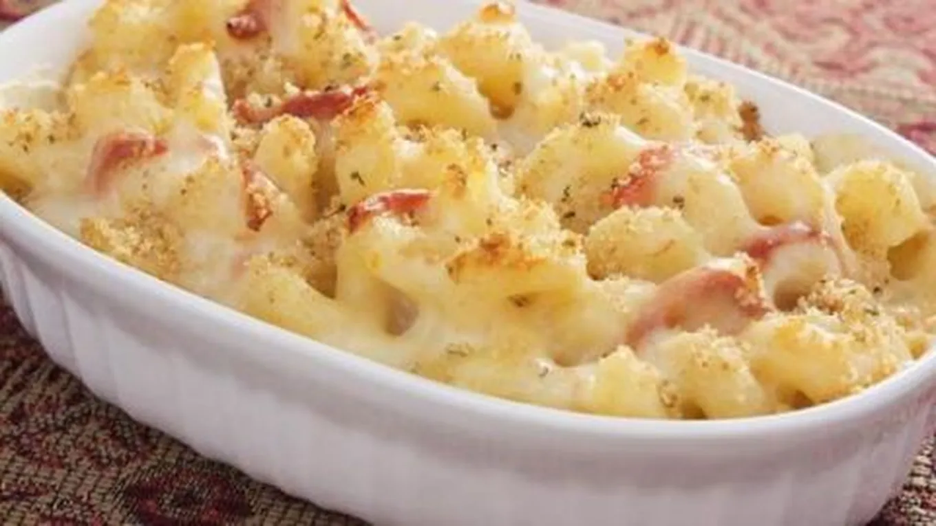 - وضع شرائح لحم الحبش المُدخّن فوق المعكرونة.