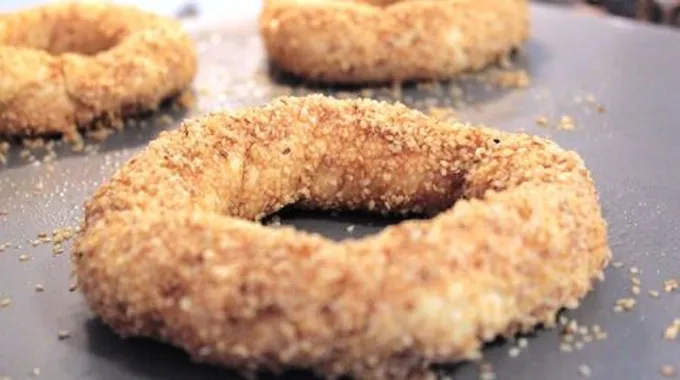 - نَغمِس كلّ قطعة عجين على شكل مجدّلة دائريّة في وعاء الدبس، ثمّ نغمسه في السمسم حتّى يُغطّي العجينة كاملةً، ونرتّبها في صينيّة الخبز، وهكذا حتّى ننتهي من الكميّة كاملةً.