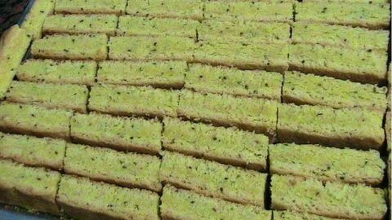 - نخرج الصينية من الفرن، ونضعها على وجهها القليل من السمسم، ثمّ نقطّعه حسب الرغبة بشكل مربّعات أو أصابع حسب الرغبة.
