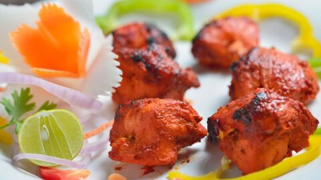 - نقطع صدور الدجاج إلى مكعبات متوسطة الحجم ونضعها في طبق واسع ثم نضيف إليها الملح ومعجون الزنجبيل بالثوم والبيض والطحين والنشا ونصف كمية الجارام مسالا والكزبرة الجافة والصبغة الحمراء والفلفل اللأسود ثم نحرك الخليط جيدًا حتى تتجانس المكونات بعد ذلك نتركه مدة 15 دقيقة على الأقل جانبًا.