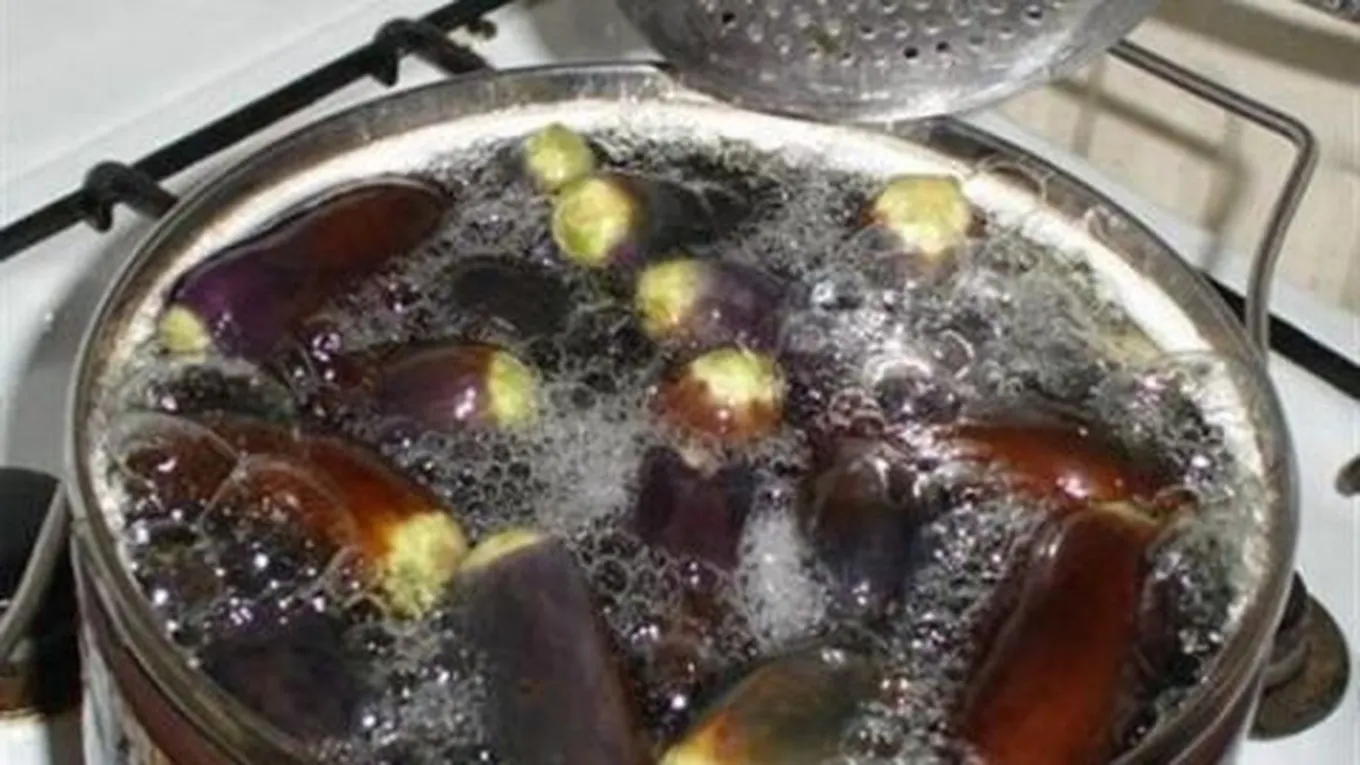 - نضع الباذنجان في قدرٍ كبير، ونضعه على النار، ونسلقه قليلاً.