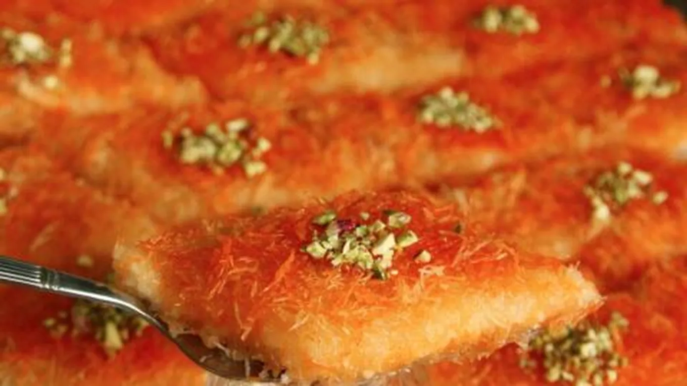 - نزيّن الكنافة بالفستق الحلبيّ، ونقدّمها.