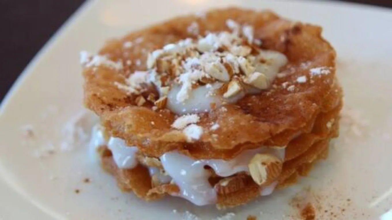 - ندخل الصينيّة إلى فرن مسخن مسبقاً على حرارة 175 درجة مئويّة، ونتركها لمدة نصف ساعة حتى تنضج قطع العجين، ويتحمر لونها.
