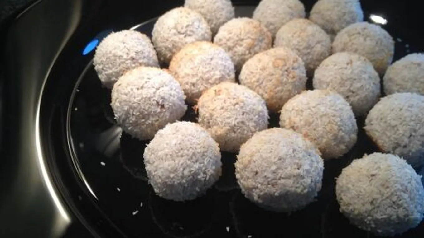 - نشّكل العجينة على شكل كرات صغيرة ونغمسها في كمية جوز الهند المتبقية.